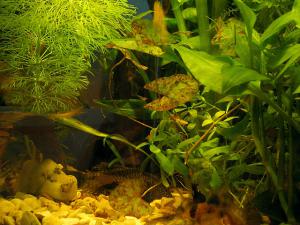 Просуществовал аквариум в более-менее нетронутом виде год и 3,5 месяца. Причин перезапуска было две - первая - стаз закисать грунт, примерно наполовину состоявший к этому времени из песчаных меланий, и вторая - хотелось всё перекроить и пересадить, а при этом поднялась бы такая муть, что хоть святых выноси, а точнее - пересаживай рыб в другую ёмкость. морально и материально я к этому мероприятию готовилась около месяца..... Нуте-с, судари мои, немного ностальгии об аквариуме, каким он был, каким он становился..... Это запуск, 3.1.2010,: Спустя месяц, 7.2.2010,: Через 3 месяца, 5.4.2010,: Май 2010: Восьмимесячное детищщо: Аквариуму почти год, - декабрь 2010 года: И таким он был перед перезапуском (часть воды уже слита): Во все тазы, вёдра, кружки и плошки была слита вода из аквариума, потом выдраны растения - выдраны, так как корни сплелись в некое подобие рыболовной сети, и, выдёргивая один кустик, я поднимала целый пласт грунта и все близлежащие кусты. Несмотря на закисающий грунт, корни у всех целые, белые и здоровые. К сожалению, при пересадке я потеряла красную нимфею, подаренную мне Justin'ой - мои подпольщики аккурат накануне ободрали в очередной раз растению все листья, а новые ещё не выросли - и я не смогла найти корень нимфеи. Очень жаль было. Потом пришла очередь живности - в старый 30-тилитровый аквариум временно переселились все рыбы, в большое ведро переехали креветки (всех так и не смогла выловить), где полдня и просидели, угрюмо озирая окрестности. Банда десятиногих: Грунт был безжалостно извлечён и выброшен, так как хранить его в качестве сувенира мне негде Подложку на сей раз я использовала такую - Подложка мне понравилась и результат земляных работ тоже: Дальше было залито около трети аквариума и высажены растения (сажать в получившийся "бутерброд" очень легко!), потом вылита аквариумная вода из всех ёмкостей и включен фильтр. Фильтр был предварительно вымыт (хоть так и не рекомендуется делать При укладке грунта очень удобной была вот эта вещь: А как сачок, данный девайс для меня оказался неудобен - слишком массивный "обод" и слишком мелкий сачок - я боялась придавить рыбу, мелочь вовремя замечала опасность, крупная рыба выскакивала. Так аквариум выглядит сейчас: Нимфея приехала из Ивано-Франковска, от форумчанина IgLa Параметры воды на сегодня: gH - 10 kH - 7 pH - 7 PO4 -5 мг/л (!!!) NO2 -0 мг/л NO3 - 10 мг/л NH3/4 - 0 мг/л. Удобрения пока не лью. Через полторы недели забился фильтр - еле-еле сочились струйки из флейты. Вернее, забился не сам фильтр, а слой фильтрующей ваты - грешу на муть и взвесь после запуска. И, наконец!,- я смогда добраться до крыльчатки и почистить её... Стоило мне это вывернутого ногтя и нескольких нехороших скандинавских слов Перезапуск имел место быть 16 апреля, 2011 года от Рождества Христова... Благодарности: