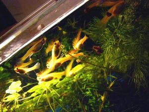 Основных изменений два - Лоцман, повзрослев, перешёл на внешний фильтр, и проведена была кардинальная прополка - три недели назад прополота левая часть, неделю назад - правая часть, ибо заросли в аквариуме уже недетские образовались. В левой части ещё туда-сюда, а справа уж полное непотребство творилось - трава повылазила наружу (особенно альтернатера зелёная), вслед за ней гигрофила и людвигия, а нижняя часть растений стала - голые переплетённые стебли. При прополке объявился анубиас нана, про который я вообще забыла, что он там есть Неожиданность преподнёс микрантемум - после его ликвидации из этого аквариума, оказалось, что пару веточек запуталось во мхе, покрывающем корягу - и теперь на коряге выросли просто замечательные, роскошные ветки микрантемума! Имеющаяся лимнофила растёт с такой скоростью, что аж страшно! Можно сказать, что это распоясавшееся растение поставило целью захватить главенство в аквариуме! Сегодня аквариум такой: Гуппи Эндлера голд (скоро надо будет раздавать, а то стайка уже перерастает в стадо): И любимые гурами (уже довольно-таки внушительные рыбки, красавцы, тьфу на них, чтоб не сглазить Пока я была в Харькове, гурами устроили полный беспредел в аквариуме - дрались и буянили так, что один из них выпрыгнул из аквариума, упал на покровное стекло соседнего аквариума и умудрился попасть через щель внутрь! Когда я приехала, этот отшельник гордо и независимо плавал в небольшом аквариуме, с презрением поглядывая на собратьев. Но был отловлен и водворён "по месту прописки", нанеся изрядный урон поголовью черри. Вообще, пока меня не было, по рассказам мужа, все аквариумы вели себя как дети, когда родители уезжают в гости - рыбы буянили, креветки нападали рыб И, в заключение, - сегодня к нам пришла зима..... P.S. Фотоаппарат при слабом свете что-то совсем не хочет фотографировать... |