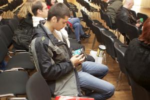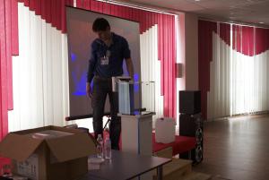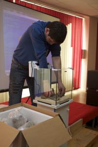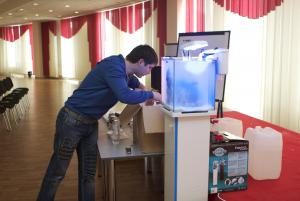 Сразу скажу! Мегауважение организаторам данного конкурса! Это настолько титаническая работа, по координации всех участников, что я просто не могу в мозгу у себя вместить масштабность данного мероприятия! Спасибо вам, дорогие. Теперь ближе к телу.. То есть к выставке. Я на открытии быть не смог - обстоятельства, о них немного позже. Приехал я как раз во время, так как на мой аквариум посягались Ксати, на первом фото видно то обстоятельство, из-за которого я задержался. Заметили? Затворы фотоаппаратов не замолкали ни ни секунду! Зрителям нравилось... Скажу честно, наш стенд привлекал таки внимание! Наверное самая яркая экспозиция была у нас. С самого начала выставки начали готовить урну для голосования. Помня феноменальные итоги голосования в России, где в некоторых регионах суммарное количество протоколов достигало солидного значения в 146%, представитель фирмы акваэль заготовил прозрачный аквариум, что бы препятствовать вбросам бюлетеней и каруселям. И народ голосовал! Подходили, общались, спрашивали, фотографировали, опять спрашивали а потом голосовали. Людей было много, гораздо больше, чем я ожидал. И все ахали, смотря на аквариумы конкурсантов. Народ, это надо видеть в живую! Это нечто феноменальное! Каждая работа заслуживает приза! Каждая! Люди, которых все знают, которые помогают нам в нелегком мореманском деле: А посетителей не убывало, ходили между аквариумами, общались с участниками, шутили, смеялись, восхищались: Соседний стенд охраняли грозные на вид африканские воины: А вот и то самое "обстоятельство", ради которого я опоздал на открытие выставки! Апогон. Смотрится - бомба! Сразу привлекает внимание посетителей! Что еще порадовало, так это красивые, добродушные девушки на ресепшине: Помимо нашего стенда, компания акваэль провела отличную презентацию с быстрым запуском нано-рифа. Фоток много. Труда - не меньше. Внимание на экран! Финальные штрихи, перед началом презентации: Зрители замерли в ожидании: Старт! Представитель компании рассказывает о нюансах нано-рифа, о самом комплекте поставки, о рифе в целом: Зрители, как на лекции, слушают очень внимательно. Артем: Мастер-класс набирает обороты. Рассказывается о преимуществах старта на живых камнях, живой воде, живых рыбках: Начинаем засыпать песок. Песок тоже живой. Зрители восхищаются мастерством лектора: И вот, в аквариум укладывается живой камень. Преимущества такого старта очевидны - очень быстрое биологическое равновесие. Наличие полезных бонусов на камне, в виде полипов кораллов. Крабы, крули, жучки. В общем все то, что делает наш аквариум живым. Кто сказал "мяу"? А камни крутим дальше: Вроде установили равновесие: Зритель з замиранием внимательно наблюдали за происходящим: Без помощника не обойтись, заливая аквас на тумбе: Теперь надо выставить фильтр: Акас засолен, вода залита, камни стоят, фильтр циркулирует, светильник установлен. Вода немного мутная, мягко говоря... Живой песок. Через несколько часов пыль уляжется, вода будет аки слеза девушки. Немного устоявшись можно садить живность: Зрители по прежнему в напряжении и внимательно внемлют: Теперь можно выпустить парочку ацелярисов: Вы видите ацелярисов? И я не вижу, но они там есть: После нескольких минут вылавливаний, лисмат-доктор был выпущен в аквариум вместе с водой: Вы видите лисмата? И я не вижу, но он там есть! Зат