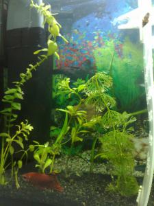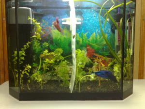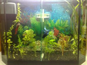 ммм, обогреватель совсем не погружной, а вы его утопили, фильтр слишком большой, нужен меньше, фон содрать и наклеять синий или другой, пойдет самоклейка со строймаркета. петухов оставить в покое, выживает сильнейший :)