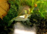 А это новый жилец - неокаридина-снежинка, 3 миллиметра длиной, сосредоточенно жуёт просто - таки громадный кусок сомовьей таблетки