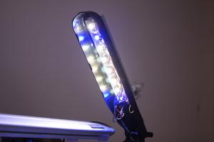Решил попробовать на зуб светодиоды. Благодяря DaimOSS заимел я штук восемь диодов разных, но остановился на шести белых и двух синих. По задумке одного светильника мощностью 25 ватт должно было бы хватить. Но примерив его на практике оказалось что маловато. Надо еще столько же. Общий план акваса не фоткаю - подзарос, но светильник - пожалуцста. Был использован ненужный акваэлевский светильник на 11 ватт, на радиорыне куплены подходящие радиаторы и маленький кулер. Ну и остального там же докупил. В итоге получился такой вот полуфабрикат: |