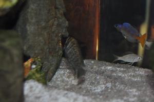 Ось й я дочекався переходу мого самця з "парубка" в "чоловіка" та й власника гарему. Кратер почав рити десь місяць тому,а сьогодні помітив, що самиця ходить й "жує" ікру.Зобу не видно ,як наприклад у ципрів, тільки по відмові від корму й певній поведінці можно зрозуміти,що сталось головна подія в житті у "кобіти". Побачимо чи виносить строк,чи в майбутньому треба бути трусити.
