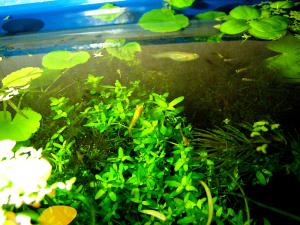 В общем, ситуация не очень весёлая, но, я надеюсь, и не особо грустная. Из грустного - коряжка слегка заплесневела и спровоцировала бактериальную плёнку на поверхности. Вот така кака у меня есть: Совершенно пропал филантус (обведён красным), а на роголистнике видно плесень с коряги: Гидрокортилла трипартита вроде больше не пропадает, микрантемум малоцветковый и марсилия пока в задумчивости - и не растут, но и не пропадают, тьфу-тьфу. Несмотря на плёнку и плесневеющую корягу, вода в аквариуме чистая и прозрачная, без намёка на какой-либо оттенок - думаю, что начинка от Seachem'а своё дело делает. Тесты аквариумной воды показали: NO2 и NH3/4 - 0 (это понятно, там никто не живёт pH - 7,5-8 gH - 7-8 kH - 6 Немного повышена карбонатная жёсткость - в других аквариумах 4-5, может, это связано с наличием лавы или керамзита. Общая немного ниже, чем в остальных, рН немного выше - в других аквариумах 7 -7,5. Поскольку параметры воды не сильно отличаются от остальных ёмкостей, то в Край запущены две вишни-камикадзе - в качестве живого теста. Хоть это и несколько жестокий способ, зато действенный и безотказный. И также заселены для подъедания всякого ненужного катушки и физы. Благодарности: