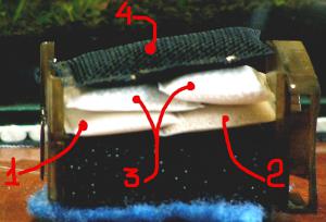 Сейчас стали видны последствия купания растений в перекиси водорода - у гидрокортилы трипартита листки как бы "обожжённые" по краям: Сильно потрёпанной выглядит пеллия и один из мхов - фонтанус. Посему - процедура требует осторожности! Не всё растения переносят её одинаково!!! Надеюсь, что всё придёт в себя.... Вода из-за "выбросов" питательных слоёв стала коричневатого цвета (коряга воду не красит, - проверено при вымачивании). Взвесь и муть осели и отфильтровались без моего вмешательства. Сменила сегодня 1/3, вот аквариум до подмены и после: Воду сливала , заодно слегка пришлась по дну - собрала "пыль". Так как растения пока в шоке и придут в себя (надеюсь!) только через несколько дней, и избыток питания для них, содержащийся в воде, надо куда-то девать дабы не пришли в гости водоросли, то я положила в фильтр доставшиеся мне в Харькове пакетики с фильтрующими материалами Seachem , - фасовка небольшая, но лучше, чем ничего. Тем более, Purigen мною уже опробован. Единственный недостаток этих нано-пакетиков - они быстро расклеиваются и наполнитель высыпается. 1-Purigen, 2 - PhosGuard, 3- HyperSorb (2 пакетика), 4- MatrixCarbon (активированный уголь). Думаю, от такого бутербродика хуже аквариуму не будет. План посадки растений: 1. Марсилия. 2. Микрантемум малоцветковый. 3. Ротала индийская. 4. Гидрокотила трипартита. 5. Гидрокотила вертикальная. 6. Людвигии репенс и рубин, бакопа маньери, хедуотис, и 2 заморыша - эхинодоруса. 7. Кабомба и перистолистник (очень чахлый, гадаю - вырастет - не вырастет....). 8. Бликса. Тоже выживание её под вопросом. 9. Ситняг. I. Мох пламя на кусках лавы. II. Пеллия, тоже на лаве. III. Папоротник на коряге. После разрастания травки, пейзаж мыслится такой: Зелёные кляксы - надеюсь, что так разрастутся длинностебельные растения. И просто фотографии (в красном кружке несчастная пеллия): Благодарности: