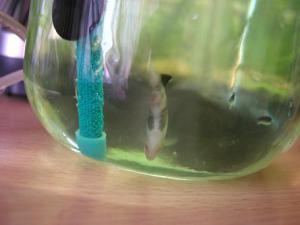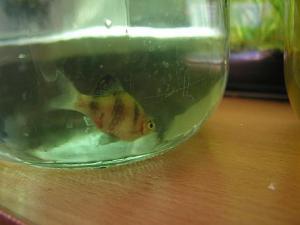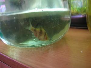 Я все таки умудрился во время кормления споймать второго барбуса. Если чесно, то Я думал, что его заклюют другие барбусята, а то они постоянно его за рану клевали, иногда к ним присоединялись другие...
