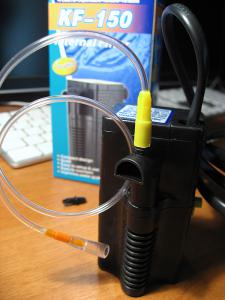 (Дополненный материал публикуемый в другой моей теме) В качестве "фильтра" я использую микро-"фильтр" Dophin KF-150. Почему я фильтр выделил в кавычках!? - ну собственно потому, что он по своей сути не может быть полноценным фильтром, но тем не менее он будет использован в качестве водомешалки ну и сбора незначительной взвеси, а также как контейнер для адсорбентов. Я не раз в своих темах упоминал, что лучшим биологическим фильтром - является правильная закладка грунта, ну а поскольку продолжительность жизни НАНО не большая, то этого будет более чем достаточно... (поверил на личном опыте) Но вернемся все же к фильтру механическому. Что же в нем такого привлекательного?! - Ну во первых - это размер, он действительно маленький, на черном фоне он не бросается в глаза даже в пустом аквариуме, во вторых мне нравится его конструкция и внешний вид, ну и самое главное он тихий (хотя попадались и с брачком)... В этом фильтре установлена поворотная трубка выброса воды с жиклером подсоса кислорода, но вместо последнего я устанавливаю веточку рябины подходящего диаметра для подачи СО2 (можно использовать сигаретный фильтр вкрученный в трубку от капельницы). Обычно для соединения таких деталей я использую часть катетера иглы-бабочки, трубочки его всего 2 мм в диаметре, а сами разъемы для шприца как раз подходят как для веточки так и для счетчика пузырьков. Вот собственно из двух катетеров я получаю соединительную миниатюрную трубку. Как-никак мы имеем дело с НАНО, и здесь стандартные решения довольно громоздки... В результате получилась неплохая миниатюрная система подачи газа, которая не "режет глаз" своим присутствием. Как установить счетчик и в каком месте - это уже дело вкуса. Я показал на пустой баночке (3,5л) как пример.. Заметка: бывают катетеры с колпачками разных диаметров, поэтому приходится иногда на веточку надевать промежуточный шланг (трубка от капельницы в данном случае)... Организация технического пространства. Поскольку мои НАНО аквариумы стоят довольно компактно, то и тумба для них одна - простой камод, секция для рубашек была переоборудована для размещения крупногабаритных технических устройств и прочего, выездной панелью с корзиной, на которой смонтированы необходимые узлы... Собственно ранее эта тумба использовалась для одного большого аквариума, теперь же она обеспечивает 4 аквариума, в первую очередь раздачей СО2. Почему "раздача" а не "подача" - потому, что аквариумы подключены к одному баллону с газом через специальный распределитель. В этой теме все подробности про устройство: CO2: система распределенной подачи Также на выездной корзине удобно разместить канистры с готовой водой для подмены. Готовая вода - в данном случае вода после очистки фильтром с мембраной обратного осмоса с добавлением необходимых минералов, другими словами на форуме Вы можете не раз встретить выражение "реминерализованный осмос", - так это оно и есть Для справки: редуктор от Аквамедик. Подробности здесь: редуктор СО2. Заметка: если у Вас маленький фильтр, ну как к примеру я использую, очень важно первые дни после старта фильтр регулярно прочищать. А также чистить каждый раз при подменах воды (почему - просто поверьте на-слово -------------------- Благодарности: