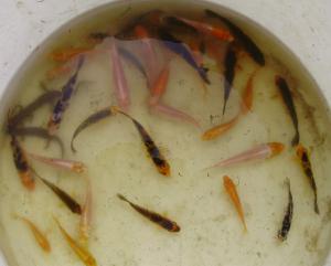 З малька годував в акваріумі трубочником,до досягнення 4-5см. розміру.Після цього випускав в декоративний ставок(глубиною 40-50см),купив самий дешевий корм для карпа (мультигеймер(для росту риби),якось так,для вигодовування простих карпів у ставках).В декоративному ставку вигодовував до 10см.,після чого випустив в став копанку (15х15м),де продовжував годувати цим самим кормом до тепер.