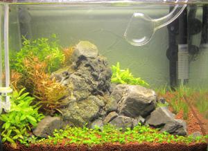 Времени было в обрез а в тебе никого не было в то время как я занимался переделками. Поэтому делал все снова на свой страх и риск следую выше указанными советам. Пот теперь пос ли часа с момента залития в аквариум воды, могу показать результат. Вода очистилась но еще не кристально чистая думаю завтра все будет выглядит лучше. Теперь все кардинально поменялось композиция с V образной с планируемыми двумя шапками длиностебельки превратилась в треугольную. Теперь длиностебелька роз положена только в левой части аквариума, а к правой идет уменьшение по размерам растений. Что есть то уже есть. Изменения каснусиль не только розтановки камней но и посадки растений. Глосостигма была высажена боле плотно при помощь тоненького прямого пинцета. Также был добавлен Хемиантус Куба между камнями. Буду наедятся что здесь он себя будет чувствовать комфортные чем в 100 л. банке. Также попытался сделать как советовал Bozhkov за главным камнем будет шапка из роталы и химиантуса. Сообщение отредактировал EGOIST - 25.12.2011, 15:00 -------------------- вступайте в группу и общайтесь я единомышленниками... История моих аквариумов... ADA Iwagumi "Для души" Iwagumi "Galaxy"] "Затопленный виноградник" by Shirakura... «Тайный смысл...» Благодарности: