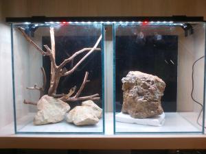 Во втором аквасе камень мне настолько нравится. что я даже и не думал ни о чем другом. Понимаю о чем ты, когда писал нет ли поменьше камешков.... Я и сам вижу, что можно было еще 2 небольших камешка дополнить. Но к сожалению он один.... И потому композиция будет строиться вокруг него. По Растениях: в первом аквасе надумал такое: папоротник таиландский узколистый или больбитис компакт (но не знаю пока где откопать), передний план - куба, меж камней - островки стаурогина, за коряжкой - скорее всего какая то из ротал, на коряжку - мох. во втором аквасе будет как то так: передний план - утрикулярия, ближе к камню опять-же островки стаурогина, а за камнем или ситняг игольчатый или ротала с мелкими листьями, а сам камень в расщелинах будет задекорирован рикардией. -------------------- Аквариумная техника и технологии в магазине -
