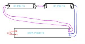 29-04-2012 года дополняю это сообщений данной схемой (где-то я это уже размещал, а вот как стало нужно ненашел) подключения ДВУХ ламп Т8 15Вт к одному ЭПРА 1*30Вт. У меня такая схема работает уже очень продолжительное время и показала свою полную техническую совместимость и пригодность. Используется ЭПРА производства Ферон.