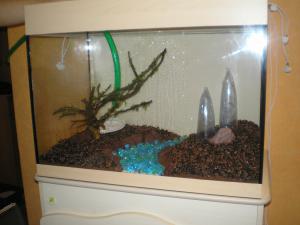 В наполовину наполненом аквариуме посадила растючку. Сменила полностью воду, набрала новой и подключила обогреватель и внутренний фильтр и подсоединила к нему самодельную флейту (в трубке от фильтра муж проделал дырочки) если фон в дальнейшем будет синий останется такая, если другой поставим прозрачную трубку. На вчера это все, целиком обессиленная упала в постель..... Сообщение отредактировал tatianashiryaeva - 17.2.2012, 11:49 -------------------- Хорошие слова сказать не сложно, но они долго живут в сердце человека! С Ув. Таня |