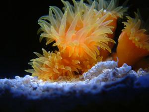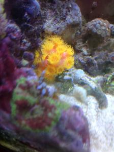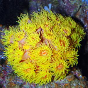 Tubastrea sp. Максимальный размер: Колонии примерно до 13 см диаметре. Ареал: Индийско-Тихоокеанский регион. Минимальный размер аквариума: 50 литров. Освещение: Предпочитает тусклое освещение, слишком яркое освещение приводит к зарастанию водорослями. Кормление: Поскольку им не хватает зооксантелл, их нужно располагать так, чтобы можно было легко кормить, поскольку кормить их нужно много. Подходящий корм включает в себя взрослых артемий, мизид, рубленую рыбу, мясной планктон. Кормить не менее двух раз в неделю. Совместимость с рифовыми аквариумами: Не подходят для тех аквариумов, где слишком мало корма или слишком много света. Содержание в неволе: Этими великолепными кораллами часто занимаются более опытные аквариумисты, готовые постоянно их кормить. При хорошем питании они кажутся «надутыми», полипы увеличиваются в размере, образуются новые полипы. В хорошей форме они размножаются бесполыми планулами. Когда это происходит, в разных местах аквариума появляются маленькие желтые полипы. Они предпочитают места с сильным течением. Обычно в течение дня их полипы втянуты, но животные могут привыкнуть к дневному кормлению и оставаться открытыми. Парочка красивых фоток солнышок Сообщение отредактировал Женя) - 16.5.2012, 21:29 -------------------- |