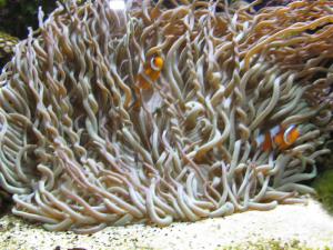 Amphiprion percula Ареал: тропические воды Индийского и Тихого (западная часть) океанов, включая Австралию, Новую Гвинею, Соломоновы острова и Вануату. Среда обитания: защищенные прибрежные рифы на мелководье (1-15 м), поблизости от морских анемон. Амфиприоны-клоуны встречаются по одиночке, в парах или мелкими группами. Описание: окрасом амфиприон-клоун очень похож на Amphiprion ocellaris. Количество лучей в жестком спинном плавнике 9-10, в мягком 14-17. При рассмотрении спереди голова у рыбки с выпуклостью, подобно лягушечьей (у ocellaris такая выпуклость отсутствует). Самки больше самцов. Окрас: рыб всех возрастов не отличается. По телу рыбки пролегают толстые черные полосы, которые разделены оранжевыми (красными) и белые полосами. Кайма плавников черная. Радужная оболочка глаз ярко-оранжевая, что визуально уменьшает размер глаз (у ocellaris радужка серовато-оранжевая, что наоборот, визуально увеличивает их размер). Размер: до 6-8 см (максимум 11 см). Враги: акулы, скаты, губаны, груперы, люцианы, кудреперы, рыбы-скорпионы, крылатки, каменные окуни, угри, рыбы-девушки и др. крупные рыбы, на икру охотятся беспозвоночные (офиуры). Продолжительность жизни: в природе 6-10 лет, в неволе до 18. Аквариум: для пары достаточно 50-70 л. Вода: pH 8,1-8,4, плотность 1,020-1,025. Еженедельная подмена 10% воды, фильтрация с активированным углем. Температура: 25-27'C. Анемоны-хозяева: Heteractus magnifica, Stichtodactyla gigantea, Stichtodactyla crispa, хотя могут жить и без анемон. Растения: перед тем как поселить клоунов, в аквариум высаживают анемоны. Оформление: желательно добавить несколько кораллов и гротов, чтобы клоуны могли там прятаться. Кормление: живые и замороженные корма: мелкие ракообразные (артемии), кусочки рыбы и кальмара, креветки; донные водоросли (спирулина, красные и сине-зеленые), сухие корма для морских рыб. Кормят клоунов несколько раз в день небольшими порциями. Подросткая в сутки необходим объем пищи, составляющий не менее 6% от их веса тела. Поведение: в каждой стае одна размножающаяся пара и несколько самцов (их роль до сих пор не известна, так как возможности размножения у них нет из-за их атрофированных гонад). Развитие подростков до взрослых рыб зависит от иерархии в стае, самый крупный самец подавляет развитие остальных самцов. Размер самой стайки зависит от размера анемона. Если рыбок становится больше чем нужно, самые мелкие самцы изгоняются. Если в аквариуме живет несколько стай, то между ними возможны периодические стычки. Для уменьшения агрессии, в аквариуме должно быть несколько анемон (чтобы хватило на всех). Клоуны знакомятся с анемоной постепенно (их соединяют симбиотические взаимоотношения): сначала рыбка медленно плавает около него и как бы случайно дотрагивается до его щупалец брюшными плавниками, затем боками, а потом и всем телом. Знакомство может занять от нескольких минут до нескольких часов. После такой акклиматизации у рыбок на теле вырабатываются слизистые выделения, которые защищают их от щупалец анемон, но если рыбка долго находится вдали от анемоны, то защитная слизь может исчезнуть. Характер: в основном амфиприоны-клоуны миролюбивые рыбки. Можно содержать с: неагрессивными и мирными рыбками (морские собачки, бычки, кардиналы, хромисы, рыбы-бабочки). Нельзя содержать с: плотоядными рыбами (угри, груперы, крылатки, спинороги). Ну и такое у меня Сообщение отредактировал Женя) - 22.5.2012, 17:37 ------