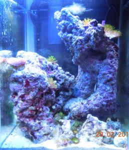 Растановка камней никуда не годится, нужно камни трощить и собирать композицию, CHE-L-CE правильно советует, камни однозначно от стекла минимум на 2 сантиметра нужно отодвинуть, морской аквас заростает очень быстро и чистить стекла нужно раз в 3 дня.