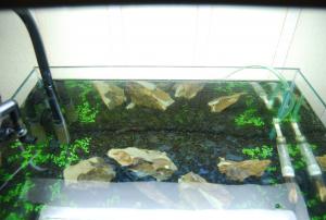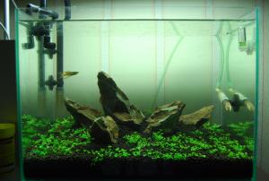 В воскресенье аквасик нашел свое место и он был наполнен водичкой! Половина водички была из действующего а остальная помесь водопровода с осмосом. Свет даю по 5 часо в день, сегодня подменю воду. На поверхности воды присутствует пленка. Самое неприятное в процессе запуска - это течь фильтра. Работает "на тряпке" так как прокапывает не интенсивно, тут даже паковка вазелином не помогла. С первого дня подаю СО2, дропчекер зеленый. Есть на грунте трошки диамантовых и местами еле заметны синие-зеленые. Вот подводка трубок от фильтра. Трубки в акве. А теперь СВЕТИЛО! Начну с места питания. Короб изготовлен из вспененного ПВХ 4мм и после чего окрашен краской из баллончика(как и все остальные детали светильника кроме трубки). Отсек в котором находится ЭПРА организовано так, чтобы всегда была возможность добраться к ЭПРА а также можно было его легко извлечь. Тут видно как подходит питание 220В к клеммам. Тот зазорчик я еще доделаю и закрою. Теперь покажу как все же добраться к ЭПРА. Верхняя панелька короба съемная и ничем не фиксируется кроме силы трения. Открыв крышку мы можем с легкостью вытаскивать сеточку которая носит не только декоративный характер, но и не дает коробу нагреваться, воздух может свободно циркулировать(сеточка была найдена в старом советском телевизоре). Подвес. Изогнутая часть готовилась очень интересно. Я взял прямоугольный кусок пластика(ширину я прикинул по радиусу трубы) и потом потихоньку прогибал его на регистре, который в мороз был прогрет градусов до 70, а потом это всё дело я прочно примотал к регистру скотчем так как нужную форму пластик не имел и не был прогрет по всей поверхности заготовки. После получаса прогрева я снял готовую деталь. Как видно на фото ниже, к подвесной части светила подходят два провода 2*0,5квадрата которые сквозь корпус (материал то же - вспененный ПВХ 4мм) прямо к патрону который в свою очередь крепиться к корпусу с помощю двух винтиков. Лампа в подвес вставляется непосредственно в патрон, а её на конце поддерживает разогнутая металлическая клипса для ламп Т8. Сам подвес пока что крепиться к стойке капроновыми нитями. Стойка - это трубка алюминиевая выгнутая буквой Г кустарым способом между близкорасположенными трубами нужного диаметра. А закреплена к основанию штукой, название которой сказать не могу - пластина, в ней 4 отверстия а в центре стержень с канавкой на конце. Скозь трубку в месте канавки просверлено отверствие и вкручен саморезик. Так можно уменшить прокручивание стойки и снятие её с опорного стержня. Надеюсь рассказал более менее доступно. И на последок еще фото. Всем спасибо за внимание. -------------------- |