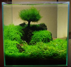 HardScape Было: 1)Аквариум 34х34х34 см 2)Два здоровенных булыжника лавы 3)Корень неизвестного дерева, размером, как два аквариума 4)Другое Сделал: Для этого разбил булыжники лавы на мелкие камни. В хлам распилил корень, осталась куча дров и мааааленькое деревце. В тех местах, где деревцу не хватало веток, доклеил их супер-клеем. Посмотрел, подумал… Показалось дерево великоватым. Взял кусачки и… ... ААААААА!! Подстриг дерево... Результат получился такой (извините за качество, фотал днем) На данном этапе есть такие вопросы к уважаемым форумчанам: 1) Прошу совета по композиции. Может еще укоротить, или вернуть на место отрезанные ветки дрэва. Подвигать камни. Увеличить/уменьшить слой грунта. 2) Помочь с озеленением. Какие растение и куда посадить. Мой вариант: засадить все кубой, а в крону яванский мох. Хочется больше растений но пока еще плохо представляю что куда. Растений нет никаких, только пережитки прошлого: анубиас, тот, что на аве 3) Вообще буду рад любым советам и замечаниям |
