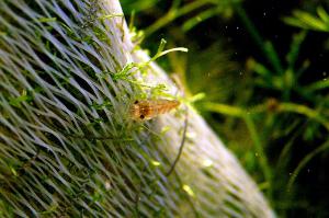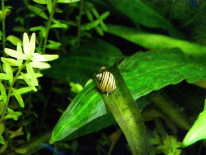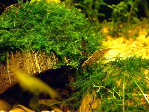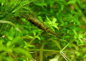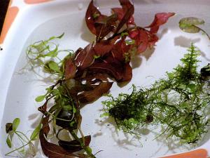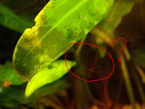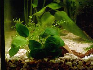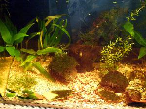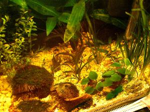 Из неприятностей самая существенная та, что на прощание Одинокий Скаляр выбил старшОй панде правый глаз, зараза! Так что у меня теперь Конфуций и Кутузов. М ещё меня посетили водоросли, вот такие: На стекле, как понимаю, нитчатка и зеленые точечные водоросли, а на листе криптокарины вроде тоже похоже на нитчатку? или я ошибаюсь? Не могу сказать, что это бяки много, но имеет место быть. Из грустного пока, слава богу, всё. Дальше - сполшное веселье! Итак, подлая личность Одинокий Скаляр, попав в дружный коллектив себе подобных, отнерестил всех, до кого мог дотянуться, уже через два дня после переселения в Ялту. Так как основной агрессор был подвергнут остракизму (он в последние дни уже и коридорасов гонял, почём зря!), то появилась возможность пополнить компанию "рыбабунчиков" (это муж их так называет). И новоселье справили четыре "чумазых чертёнка"- маленькие (сантиметра по 2-2,5) жемчужные гурами. Аквариум для них, пока, большой, держаться они часть времени стайкой, потом разбредаются, потом собираются вместе и изображают медитацию коллективного бессознательного. Потом, общупав друг друга "усами" и убедившись, что все и всё на месте, опять разбредаются по аквариуму. Очень любят сидеть под роголистником и выискивать там остатки трапезы или жевать корешки ряски. Ряска потихоньку разрастается и, если смотреть снизу, "из-под воды", то растеньица, кружась в течении от фильтра, похожи на маленьких балерин в зелёных пачках: Взамен съеденных Скаляром креветок запущена жменька новых веслоногих, из коих каждой твари по паре - есть и красные и прозрачные и зелёные. Весь этот калейдоскоп я поменяла на кусок мха Christmas, благо он у меня хорошо растёт. Я вообще развила "бурную деятельность" по обмену кое-чего на чего-нибудь, результаты пока не огорчают. В обмен на кубинский роголистник ко мне пришли два эхинодоруса, один большой зелёный, второй маленький красно-коричневый. Учитывая мешок растений, полученный за скаляра и подарок и мхи от кокон (за что ему огромное спасибо), у меня теперь не аквариум, а подводные джунгли зачаточного состояния. Зачаточного потому, что неизвестно, что приживётся и пойдёт в рост, а чему, к сожалению (но я надеюсь в дальнейшем исправиться) я не смогу обеспечить достойные условия существования. Итак, на сегодняшний день список растительности такой: 1.Валлиснерия-гигантская, спиральная, обычная и тигровая. 2.Людвигия ползучая (старые листья красно-сиреневые, новые зелёные; наверное, нехватка света) 3.Гетерантера остролистная, нежнейшее (по виду, а не по содержанию) растение, цвет - непередаваемый! Такой оттенок зелёного цвета редко встречается, как молоденькие, только что проклюнувшиеся листочки. 4.Эхинодорус розэ (по-моему, у меня их теперь два) 5.Перистолистник, веточка. 6.Гигрофила иволистная, очень красивое растение. 7.Бликса японская, два кустика, может, приживётся, я надеюсь. 8.Погостемон 9.Hedyotis salzmannii 10. Мох павлиний / Taxiphyllum sp 11. Мох Fissidens fontanus И были у меня вначале: 12. Ротала индийская (растёт, потихоньку подстригаю и тут же сажаю) 13. Мох яванский 14. Мох Christmas 15. Две большие криптокарины с двухцветными листьями - верх тёмно-зелёный, низ тёмно-красный, и одна криптокарина поменьше со светло-зелёными листьями. 16. Анубиасы нана 17.Гигрофила лимонолистная (лимонник) 18. Микрантемум малоцветковый, постепенно приходит в себя после геноцида, устроенного е