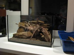 Продолжим, теперь нужно подготовить материал для дизайна, сварить кашу из камней и бревна, промыть грунт до чистой воды и раскисших рук, и приклеить скотчем подложку под аквариум (я использовал обрезки линолеума, а торец подкрасил черным маркером) Бревно (корень акации) пришлось прикрутить самарезом к камню (см. фото), чтоб не всплывало. И затем самый интересный и волнующий момент, незабываемая ночь вместе с камнями и корягами. Пытаясь запихнуть в стеклянную банку мешок камней и коряг, надо пытаться чтобы еще и красиво вышло. На заднюю стенку я приклеил скотчем темный фон из камней. ____________________________ Сообщение отредактировал ZERG 007 - 14.12.2009, 18:45 -------------------- Сергей (повелитель полосатых тараканов) Благодарности: