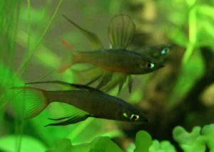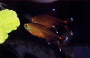 Длина самца до 5 см, самки до 6 см. Тело вытянуто в длину, относительно невысокое, уплощено с боков. Имеется жировой плавник. Мирные, стайные рыбы, держатся во всех слоях воды. Резкие изменения условий вызывает шок, который также часто наступает при вылавливании рыб сачками. Можно содержать в общем аквариуме, местами растения с плавающими или расположенными близко к поверхности листьями. Вода: 22-26'С. DН 2-12', рН 5,5-7. Освещение от 0,5 Вт/л. Корм: живой, заменители. |