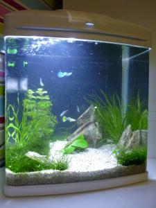 неделю с хвостиком я терпела дребезжание оригинального фильтра Sobo. вчера заселила двух неонов-драчунов, их колбасило в банке, как в миксере. урезала лопасти крыльчатки, поток ослаб, но дребезжать стало невыносимо громко. наступила жабе на горло и купила фильтр Tetra IN 300+, заменила губки синтепоном и возрадовалась относительной тишине и аэрации. так же купила трех самцов гуппи и здоровенный куст бликсы. немного досыпала грунт, убрала часть мха. сейчас в банке присутствуют: лимнофила, яванец, бликса, эхинодорус везувий, анубиас нана голд, какой-то росточек (возможно папоротник винделова) два неона, три гупака, катушка. и градусник, на котором +29-30. что делать с этой жарой, не знаю. а надо еще пятерых неонов переселять.