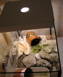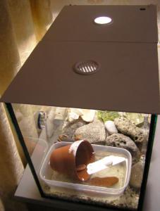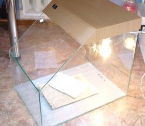Сегодня закончил черепашатник - если считать по объёму то получается почти столитровка. Будет проживать сухопутная черепаха, поэтому для лучшего доступа был сделан скос в передней части стеклянной банки. Светильник , конечно же, получил точно такой же скос.