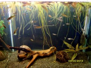 igorlab, я делал так аквас на 50 - 70 литров, сажал родителей на нерест, после нереста убирал родителей, понижал уровень воды (сливал на половину), направлял течение на икринки чтобы их слегка "омывало" струей и включал стерилизатор. Как только молодь появилось стерилку убирал, кормил живым кормом + самомес (самодельный корм) росло нормально, потери конечно были но минимальные