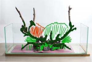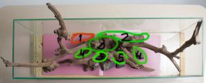 Хардскейп та ескіз Саме так, спочатку хардскейп, а вже потім ескіз. Інколи, не маючи ідей, щодо композиції майбутнього скейпу, ти починаєш просто переставляти декорації, намагаючись придумати щось на льоту із того, що є під руками. Власне, це одночас і відповідь на питання, чому я вирішив записатись у команду Ryoboku. Корчі у мене бухи хоч якісь, а от каміння... Тож засівши одного вечора із грудою яблуневих гілок я спробував щось із них спорудити. Взагалі, стосовно створення хардскейпу, я намагаюсь дотримуватись принципу "не заважай харду своїми ідеями". У більшості випадків це спрацьовує. Якщо матеріал хороший і його достатньо, то він сам, невідомим чином, оформиться у гармонійну композицію. Головне не заважати. Тож я не заважав і груда гілячок розташувалась наступним чином... Залишалось лише зафіксувати результат швидкоплинної магії... ... забезпечити йому нульову плавучість за допомогою шурупів із нержавійки. У якості звязуючого елементу була використана звичайна канцелярська папка, а у якості захисту дна - ізоляцію із будівельного магазину. Ну і власне ескіз. Художник із мене ніякий тому ескіз більше схематичний. 1. Ротала індика 2. Хемеміантус 3. Поки не зрозуміло, або гідрокотила, або той самий хемінтус 4. Ехінодорус ніжний 5. Стаурогін Забув вказати на схемі. По куткам від ротали і хеміантуса буде блікса японіка. Основна ідея при посадці: розташувати рослини із крупним листом спереду із поступовим зменшенням вглиб акваріуму. Ну і наостанок фото харду із світильником який буде використаний у цій роботі. Сообщение отредактировал reporter - 8.2.2013, 22:20 -------------------- Благодарности: