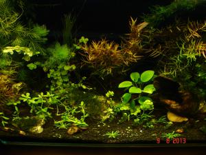Теперь изложу что было сделано. Первым делом я сделал крышку под освещение. Так как на мой объем было сложно подобрать ЛЛ, решил поставить экономки вместе с ЛЭД. Отыскал дома лист текстолита и из него сварганил крышку. Теперь свет такой: экономки MAXUS 2*26вт 4100к; 2*20вт 2700к; ЛЭД три светодиода Cool White XT-E, и 2*Warm White XT-E, Оптика LEDIL C11624_GT3-WW. Растения: Погостемон Хелфери, Перистолистник матогросский зеленый, Глоссостигма, Ситняг игольчатый, Лилаеопсис (лилеопсис) бразильский, Аммания Бонсай, Дидиплис диандра, Гидрокотила трипартита, Хедиотис, Микрантемум тенистый, Азолла, Анубиас бартери нана. Мхи: Крессенд; Бразильский; Сингапурский; Феникс; Кристмас; эрект; Мох пламя; Чина; Плачущий; Перл; мох миллиметр; Пьекок; Флат; Pulan nias; Бабл; Очень надеюсь, что в скором времени появится риккардия. Из декораций: три небольших карпатских камня, коряга из корня дуба. Мох живет на вываренной виноградной лозе. Из фауны пока ползают пару залетных физ. И немного расскажу о развитии событий в аквариуме с 1.06 . Первые день вода держалась прозрачной, на второй резко помутнела и пожелтела. Пожелтению, скорее всего поспособствовала коряга. На поверхности начала скапливаться пена, на стенках появился "пыльный" налет. На всех корягах появилась слизь, которая, кроме как под проточной водой не хотела убираться. Первую неделю делались ежедневные подмены воды примерно 25-30 % К концу недели вода стала полностью прозрачной. Через четыре дня на стенках появились живые хрени, похожие на плоских или круглых червей. На пятый день жизни на ситняге и стеклах появились маленькие нитчатые водоросли. Ситняг я все равно планировал обрезать, так что обрезал вместе с водорослями. В этот же день я наконец-то дождался появления молодых листочков на всех растениях, мхи тоже очень порадовали появлением нежной зелени на концах веточек. Вчера на переднем стекле заметил появление водорослей, хотел счистить, но уже было поздно, пошел спать...оставил на утро. счищать не пришлось. Из удобрений вчера первый раз внес Флорастим Калий. Пока что им ограничусь до тестов, а может и после. Время покажет. Вот такая история. По мере изменений буду выкладывать фото и описание событий. Комментарии приветствуются! ПС. Для себя в тетради веду ежедневные записи, чтобы потом проанализировать ошибки и сделать выводы. Сообщение отредактировал Serij0109 - 10.6.2013, 10:40 -------------------- |