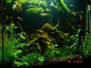 Гупачки с меченосцами потихоньку множатся и процветают, а вот креветки пропали почти все, причем за одну неделю. . Из растений остались анубиасы, нимфея, крипта, стаурогин, аммания и пару видов мхов. Остальное убрал, так как аквариум выглядел ну оооочень перегруженным. Сегодня аквариум переехал домой к родителям. Жители переезд перенесли нормально, заодно и креветки понаходились. -------------------- Благодарности:
