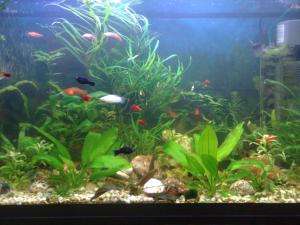 -------------------- -------------------- аква 200л - мой "малави"... свет: 1 hagen aqua-glo 30вт + 1 hagen marine-glo 30вт; фильтр tetratec ex700; компрессор tetratec aps 100; грелка aquael comfort zone 150. рыбы: labidochromis caeruleus "yellow" - 5, pseudotropheus elongatus - 4, melanochromis johanni "orange" - 3, melanochromis chipokae - 3, aulonocara spec. "red rubin" - 3, aulonocara maylandi - 3, ancitrus multispinnis - 3, crossocheilus siamensis (SAE) - 2. |