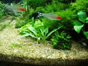 Достал запылившуюся старенькую мыльничку, сделал пару фото,а-то телефотом фотать уморился.Первое фото общего вида аквариума после борьбы с водорослями,т.е. выздоравлевающего,второе фото любимого растения криптокорины парва, ну и фсиденс Тайвань попал в кадр.