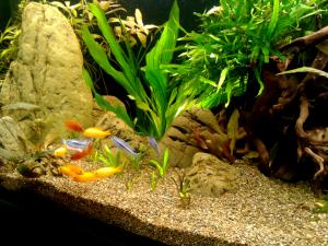Подложка-да подстраховка, чтобы не крошился пенопласт, посоветовал человек, который занимается цихлидами профессионально. Камни...двигаю....ищу картинку....нехватает средних по размеру камней и для цихлидника маловато, можно было бы еще заказывать. Грунт....ну тут случайно получилось, достался вместе с камнями. А вообще хотела белый кварцевый песок ( не нашла белый-только сероватый) , заказала желтый кварцевый песок 0.4-0.8мм, приехал-лежит на полу вместе с бутовым камнем. Так что если мне не понравится..после просветления...могу поменять картинку...Не могу понять какой будет картинка и общий цвет акваса, если поменять одну лампу на Marin glo, сейчас общий цвет- молочного шоколада...С рыбой ....Первыми запущу Васильков. И думала еще точно возьму ellow....Хотела зебру взять, но они вроде как злостно относятся к растениям. А я присадила уже пару кустов эхинодорусов, криптокорину, валиснерию и нимфею лотус ред. А что бы вы посоветовали из рыбки- яркой в младенчестве?