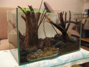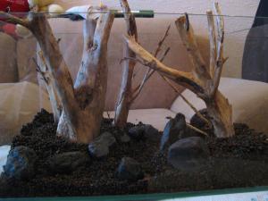 Растючка – как уже писалось выше, часть необходимого приобретена на Киевской птичке, часть нарезана Коряги. А вот на корягах хочу остановиться поподробней. Повторюсь – изначально дизайн планировался на подобии работы Для заполнения всех пустот и имитации корней и веток деревьев - организована экспедиция в близлежащий лес, найдено парочка поваленных деревьев и получено сырье, которое подготовлено во полному технологическому процессу (выварено, вымочено). Коряжки были доработаны, добавлены ветки и корни. Но что-то в них не так и не то. Мои сомнения подтвердил Игорь он же КОКОН. После чего идея была модернизирована!! Подкрепившись вот такими видами и немного во такими (автора к сожалению не знаю и сайт-первоисточник не сохранил) оставив за основу идею леса, из заготовленных ранее коряг сотворено 3-и деревца расставлено и … вот что получилось За качество фото прошу простить – поменяю (фоткать просто не было где). В общем так и родились мини-джунгли. |