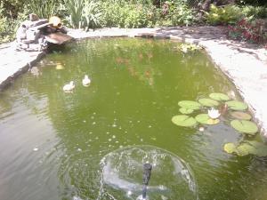 В водоеме просто совсем нет растений, которые могли бы конкурировать с водорослями, плюс "дурацкий" фонтанчик добавляет килорода и услиливает цветение.