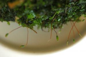 Если не ошибаюсь, то "цветы" мха - созревающие споры, которые могут развиваться как под водой, так и на воздухе. Период созревания спор может длиться до 2-х месяцев.