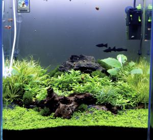 На время отпуска пришлось оставить аквариумы напрызволяще, и надо же такому случится, что имеено в этом отключилось СО2. Возвратившись домой я получил разросшуюся растительность и, естественно, обилие водорослей... Боролся. Вроде поборол. Осталось только немножко на камнях и корягах. Свет добавил только недавно. Теперь 1 вт/литр, холодный спектр. По моим наблюдениям куба прекрасно росла и при 0.6 вт/литр, а вот бликса и погестемон - не очень... Зато у анубиасов такие лопухи повырастали, как никогда. Но теперь, надеюсь, все прийдет в норму. УДО - "Tropical", 1 мл/1-л воды. Вода - осмос + водопровод. Подмены - раз в неделю 1/3 объема. Балонное СО2 - на глаз. Из живности - 5 молинезий, но одна почему то потоянно прячется. Когда зарастет куба и стаурогин - подсажу еще кристалов, что бы добавить веселых цветов в аквас. Скоро, кстати, будет понятно почему такое название у баночки;) Фото: Благодарности: