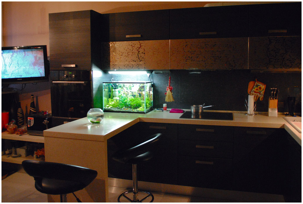 Поставил я как то в кухне аквариум, прямо на рабочую поверхность. Долго жена ворчала, а мне нравится.