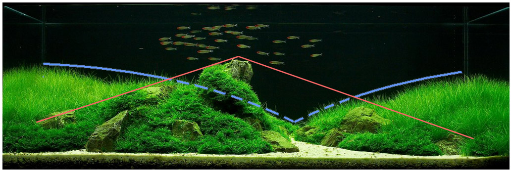 Линии в композиции «Альпийская долина» очень четкие - это характерно для западного стиля акваскейпинга, что, по-видимому, является наследством традиции оформления голландского аквариума. Такие линии создаются благодаря контрасту соседствующих групп растений и их строгой разделимости друг от друга.