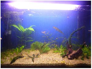 12.02.2011. Сегодня будет прополка, растёт всё очень быстро, водорослей нет, грунт не закисает,а стал плотным. Корни растений мощные и их практически не вырвать. В аквариуме развилось много циклопа и сегодня утром запустил 8 шт. (сколько поймал за раз) мальков неонов (Paracheirodon innesi), к обеду популяция циклопов значительно сократилась, а мальки плавают с полными брюшками и по видимому им охота очень нравится.