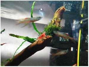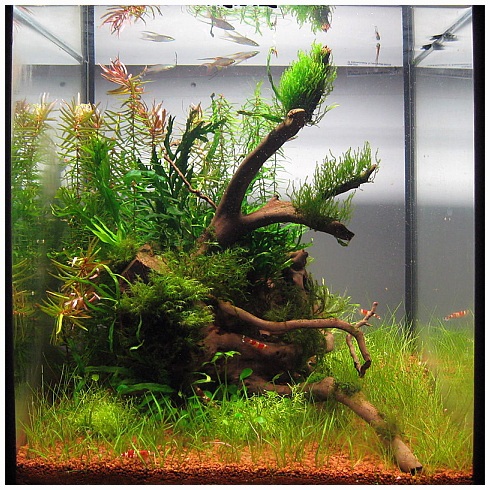 Население: Рыб хотелось мелкую стайку ириатерин (Iriatherina werneri), возможно зеленых неонов (Hemigrammus hyanuary). Разбавить их молчаливое порхание я решила креветками Red Crystal (которых вы вскоре увидите). Но пока в аквариуме креветки черри (Neocaridina denticulata Red Cherry).