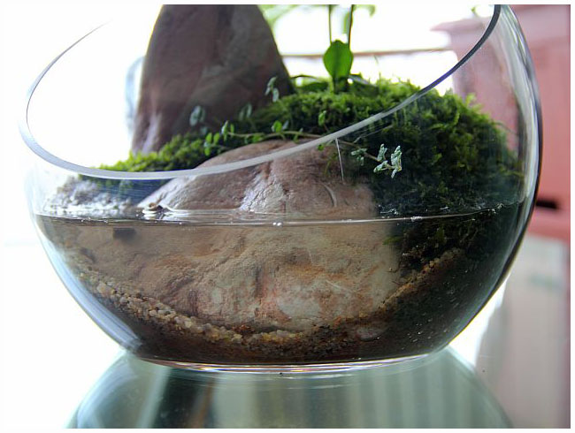 Для этого стиля подходят небольшие по объёму аквариумы (в том числе и круглые), вазы, салатницы, глубокие миски. В отличие от палюдариума, Wabi-kusa скорее бонсай в воде. В качестве растений больше всего подойдут мхи, папоротники, анубиасы, эхинодорусы. Можно компоновать аквариумные и сухопутные растения, любящие влагу – такие, как, например, орхидеи. Все эти виды растений могут быть выращены отдельно, а затем из них формируется композиция в виде острова или с применением ветвистой коряги. В качестве грунта может быть использован светлый песок. Уровень воды не столь важен, поскольку многие аквариумные растения, применяемые в данном стиле, одинаково хорошо растут как под, так и над водой. Можно создать Wabi-kusa и полностью из сухопутных растений, как в статье.