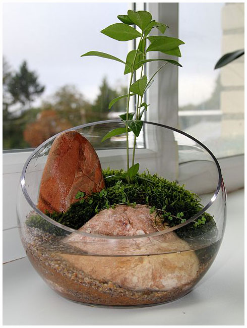 Вода простая, из крана, только отстояна. Менять, не меняю только раз в 2-3 дня доливаю. Барвинок посажен в песочек, а потом наверх приложил мох. Вазу не прикрываю вообще, мох не опрыскиваю - влаги хватает. Держу в затенённом месте, - барвинок, как и мох, не любят яркий солнечный свет.