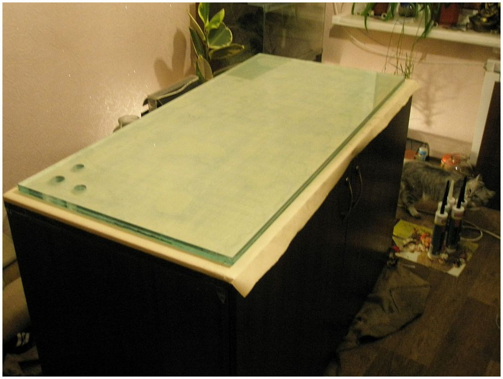 Стекла дна сверлил по отдельности, а потом склеил.После склейки стекол дна, дал просохнуть двое суток, а затем склеил все остальные стекла. Ребра и стяжку клеил через 2 суток, чтобы не мешали мне при чистке швов, ребра вклеивал не переворачивая аквариума при помощи струбцин, получилось превосходно. Аквариум я собрал на соудаловском силиконе, мне он в работе очень понравился, да и по характеристикам он выше чем ден браун. Аквариуму я дал выстоятся 10 суток, прежде чем я его начал передвигать. Размеры емкости 130 см. х 60 см. х 65 см. (ДхВхШ).