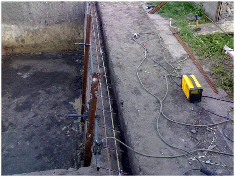 По периметру бассейна копаем еще дополнительный уступ 200х300 мм., - это будет бетонный пояс, на который в будущем будет укладываться тротуарная плитка. По периметру этого уступа пускаем профильную трубу 20х40 мм., вколачиваем арматуру на метр в землю, провариваем это все для прочности, наплавляем на трубу еврорубероид по всему периметру бассейна.