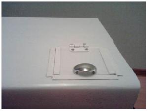 Края вырезанного окошка и самой дверки обклеиваем нарезанными кусками уголка и прикручиваем ее к крышке с помощью петельки на саморезы. Затем прикручиваем ручку, для удобства. Также необходимо приклеить ограничитель, чтобы дверца не проваливалась внутрь.