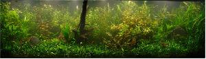 Проект оформления составлялся на этапе определения габаритов, под влиянием картинок Амано. Коряга нашлась неожиданно легко и быстро в лесу на берегу Волги. Дизайн прорабатывался не под какие-то конкретные названия растений, а под формы крупных кустов-зарослей. Разных растений побывало немало (хотя и не много, если сравнивать с кем-то), но концепция первоначальная, я считаю, почти не изменилась. Сифонка грунта проводилась всего дважды: впервые было перепахано все дно, во второй раз – грунт промыт частично, только где прореживались заросли анубиасов (Anubias) по переднему краю.