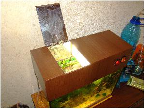 При попытке посадки понял, что делаю что-то не то,- поднимаемая при малейших движениях муть сводила все настроение на нет, а на следующий день, при попытки поправить, психанул, и все выбросил, дно засыпал просто светлыми камушками и заново пересадил все растения. Включил воздух и бац… брызги попали на лампу и она, естественно, накрылась, пришлось думать, как закрыть лампы от попадания капель воды, заодно сразу кое-что исправил в самой конструкции крышки, ведь раньше я пропустил трубку для подачи воздуха и кабель питания фильтра в отверстия крышки, что оказалось очень неудобно, пришлось резать канавку чтоб при снятии крышки они оставались нетронутые.
