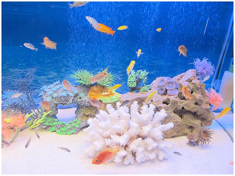 Декорации - камни, вроде песчаник. Искусственные кораллы - трикси (в принципе, хорошего качества, но во время лечения рыбок от ихтиофтириоза, костапур покрасил многие из них в зеленый цвет). Также положил натуральный мертвый коралл, для увеличения жесткости воды, что вроде неплохо для малавийских цихлид .