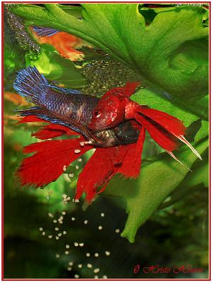 Сам процесс спаривания происходит недалеко от гнезда. Самец и самка делают круговые движения, как бы оплывая друг друга по кругу. Далее самка ложится на поверхность воды, самец обнимает ее всем телом и выдавливает икринки. Этот процесс выглядит очень нежно и романтично. Икринки падают на дно аквариума, и здесь задача самца ртом собрать все икринки и выпустить их в гнездо, где они прикрепляются к пенке и будут там плавать пока не вылупится малек. Во время того, как самец собирает икринки у самки появляется время отдохнуть. После чего процесс повторяется.